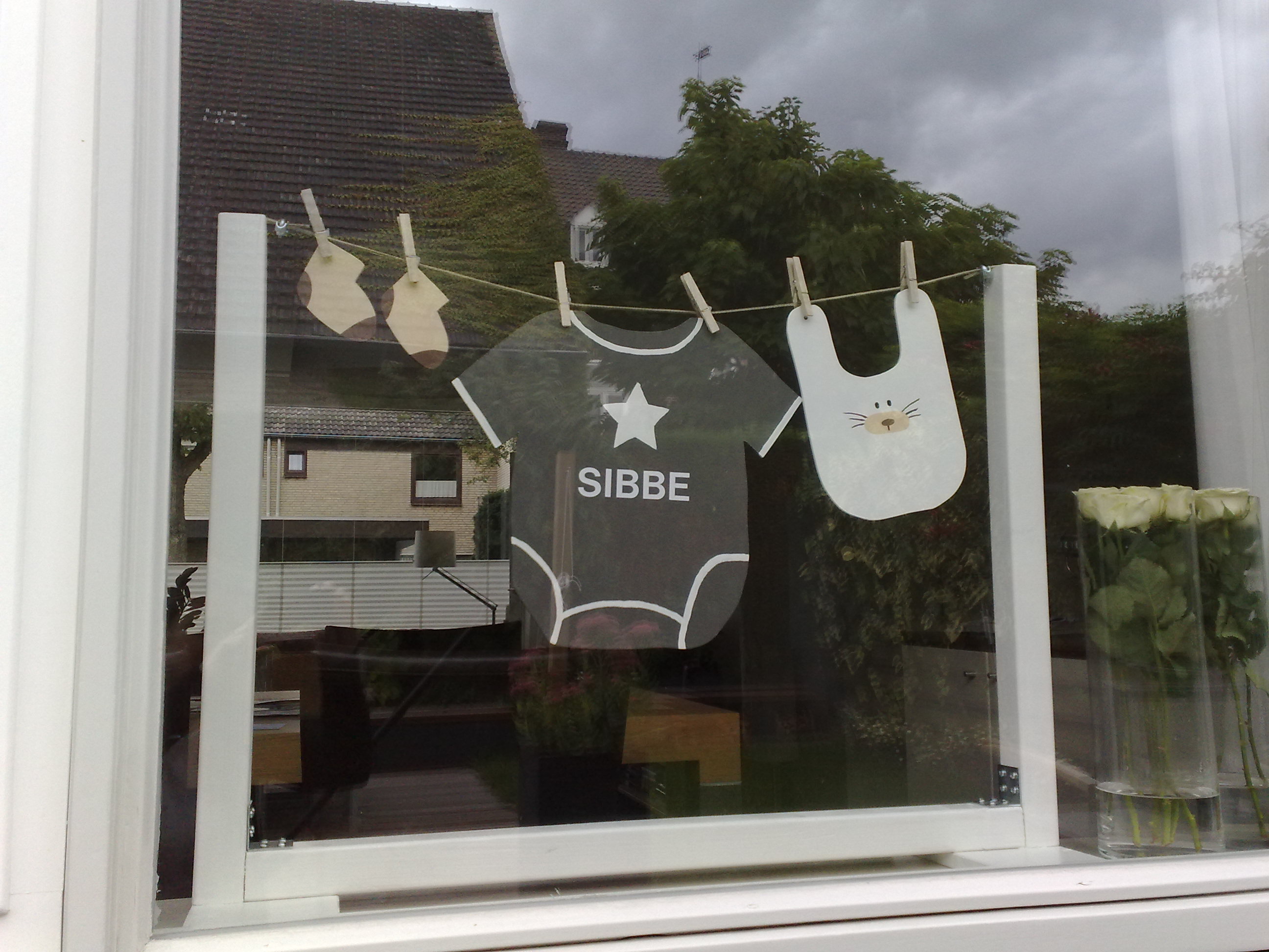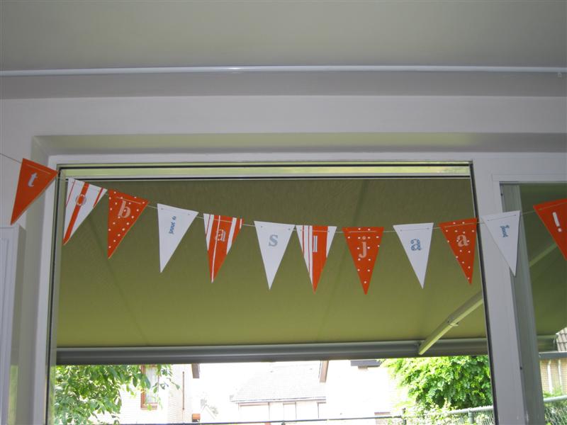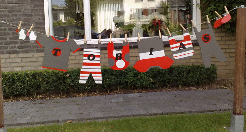 Een slinger met houten vlaggetjes met de naam van de boreling of de jarige erop!